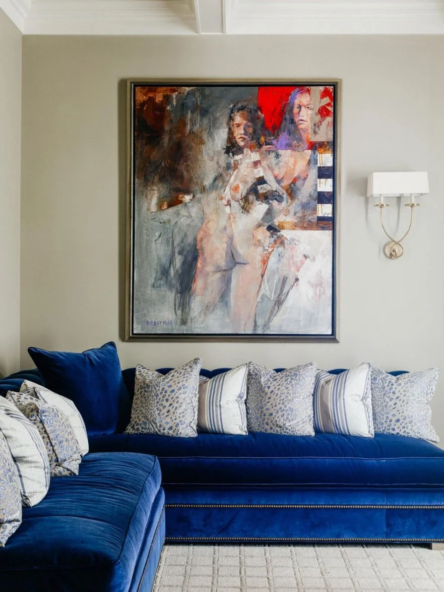 A custom bench paired with chairs and an ottoman optimized seating in our client’s living room without obstructing the path between doorways. Our signature vibrant colors connected the various spaces and brought this home to life.